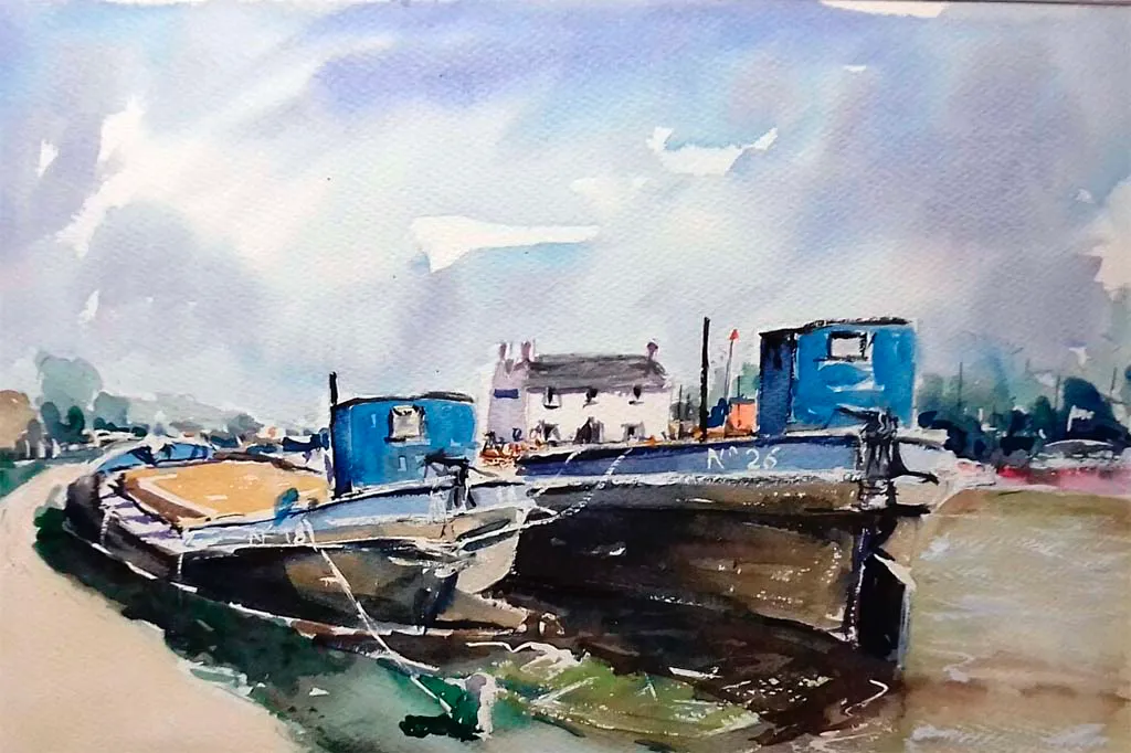 Mud barges, Gloucester to Sharpness canal. Watercolour.